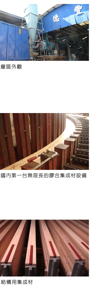 與大藏聯合建築師事務合作「池上車站」,德豐木業負責車站大廳的木結構,包含材料處理與曲樑製作加工。這是台灣現今尺度最大的國產結構用彎曲集成材建築,也是德豐承接過量體最大的木結構工程,組裝方式以特殊內埋鐵板為關鍵,單支曲樑長度達八點五米,曲樑兩端各被一組雙曲樑扣夾接合,雙曲樑兩側再以十四支金屬摩擦栓固定一點五米長的雙T字內埋鋼板,最後固定於鋼筋混凝土的地板結構。如此拱樑組共有十九組,大廳的跨距十一點八米,縱深六十五米。